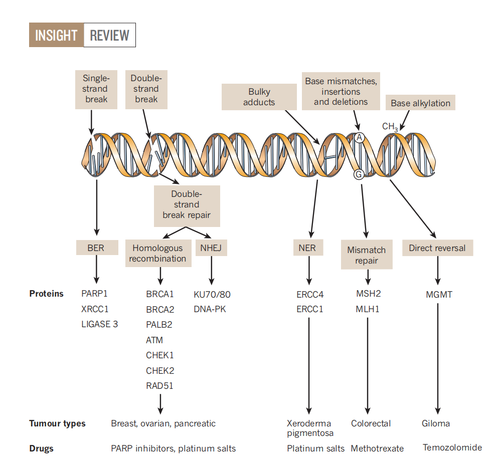 人体内有多种DNA修复机制,其中重要的DNA修复机制包括了以碱基切除修复(BER)为主的DNA单链修复和以同源重组修复(HRR)和非同源末端连接(NHEJ)为主的DNA双链修复。